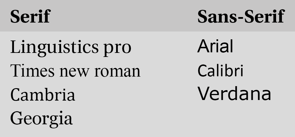 Of je voor een Serif of een Sans-Serif lettertype kiest hangt af van wat voor uitstraling je wilt dat je proefschrift heeft. Een Serif lettertype geeft een klassieke uitstraling terwijl een Sans-Serif lettertype een moderne uitstraling geeft. Hieronder staat een voorbeeld van een aantal Serif en een aantal Sans-Serif lettertypes.