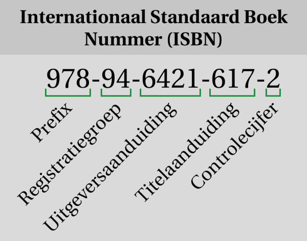 Een ISBN is een 13-cijferige code die opgebouwd is uit 5 elementen: